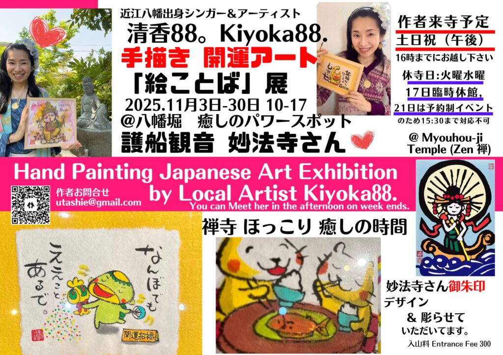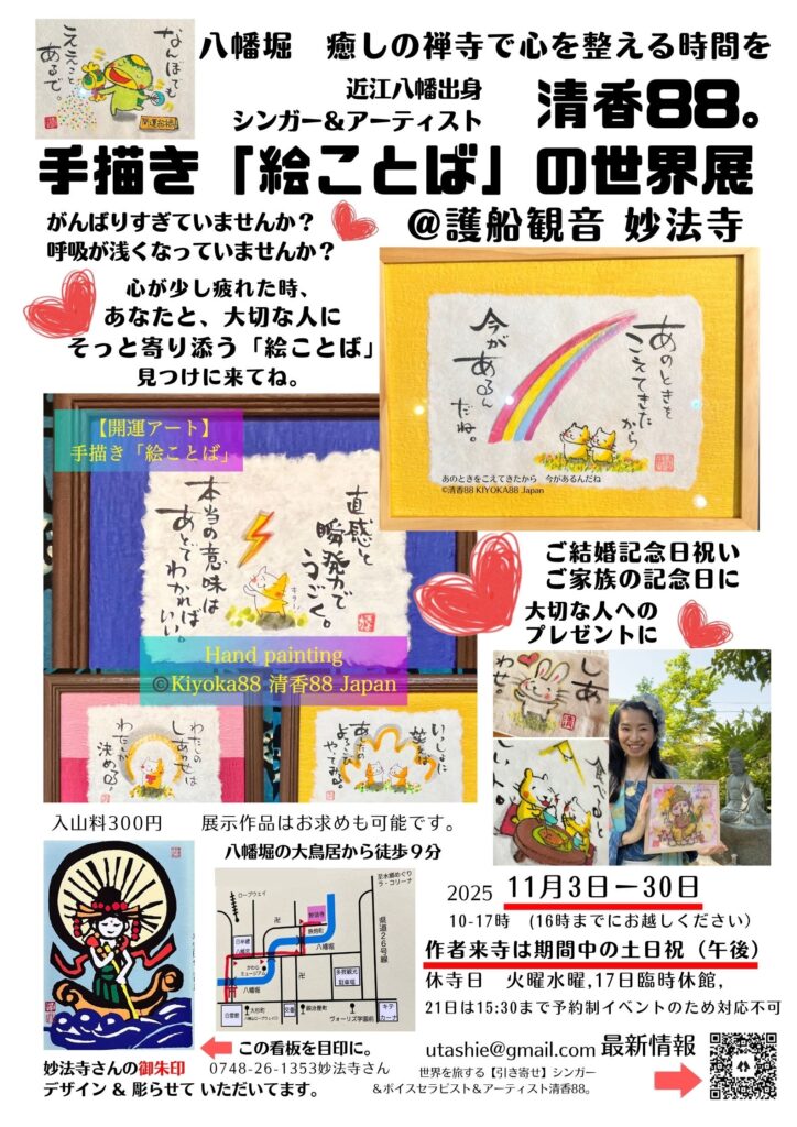 心が少し疲れたとき、そっと寄り添ってくれる「絵 と ことば」があります。近江八幡・八幡堀にある「癒しの禅寺」護船観音 妙法寺にて、地元出身シンガー&アーティスト 清香88。(きよかえいてぃえいと) によるほっこり手描き「絵ことば」展が開催されます。